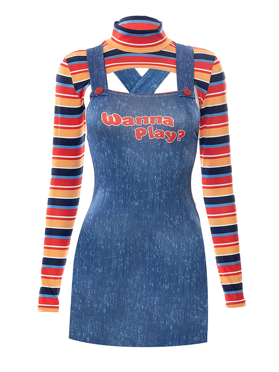 Halloween Scream Costume for Women Creepy Killer Doll Costume Long Sleeve Rainbow Tops Overall Skirt SetFeatures: