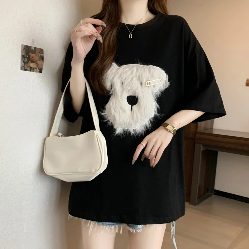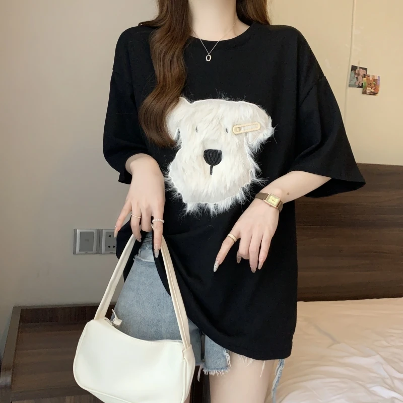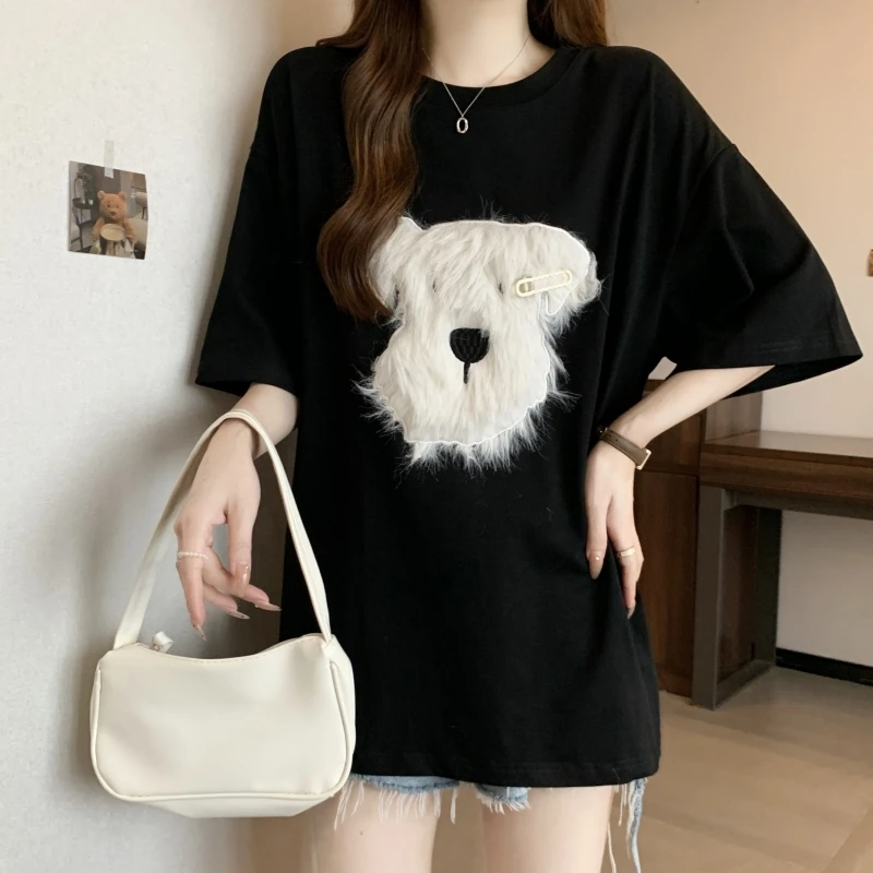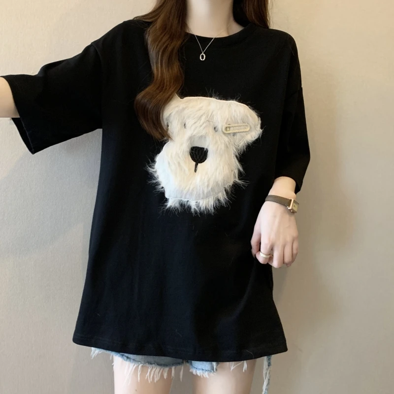 Cute 3D Plush Puppy Women’s T-Shirt – Summer Loose Cotton Half-Sleeve Top, Lazy Style Casual Tee