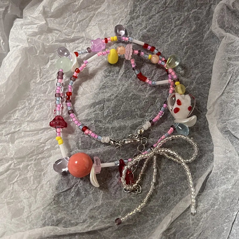 Harajuku Y2K Colorful Beaded Bow Pendant Necklace – Aesthetic Acrylic Jewelry for Women & Party Wear