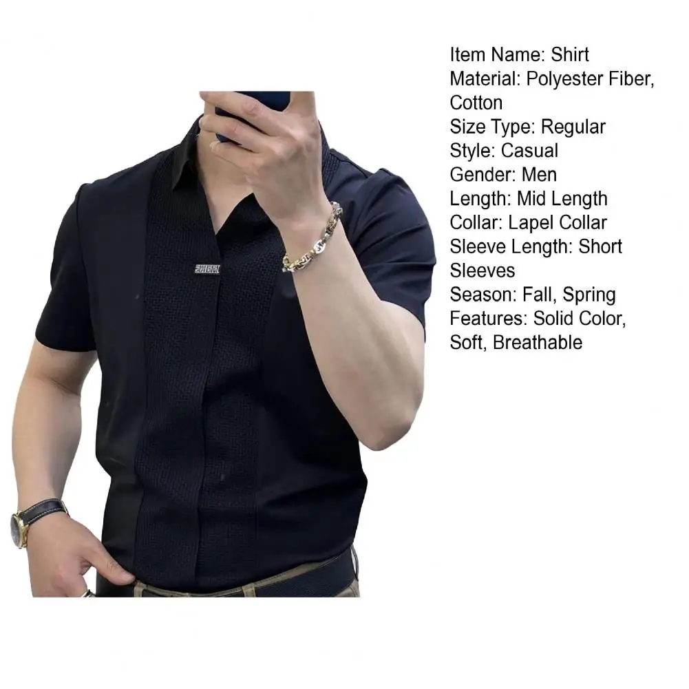 Men Summer Shirt Turn-down Collar Short Sleeves Solid Color Slim Fit Patchwork Soft Breathable Formal Business Style Men Top