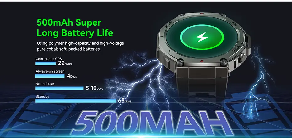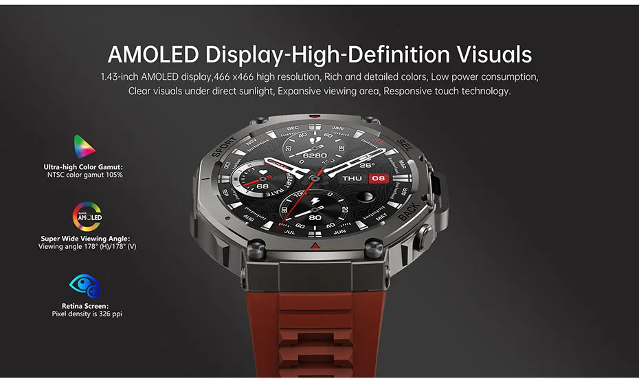 1.43-inch AMOLED display,466 x466 high resolution, Rich and detailed colors, Low power consumption,Clear visuals under direct sunlight, Expansive viewing area, Responsive touch technology.