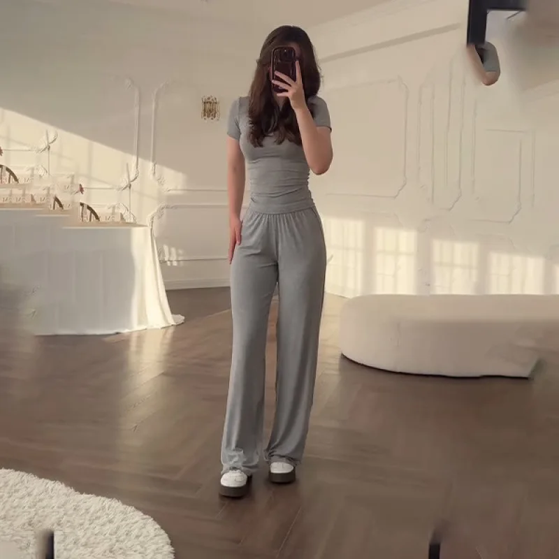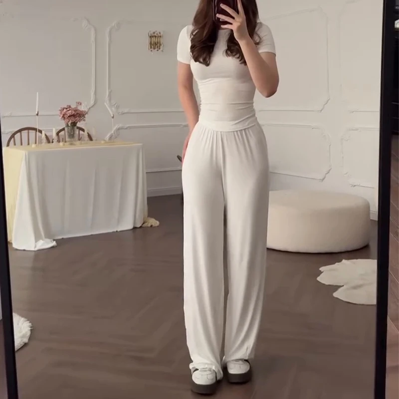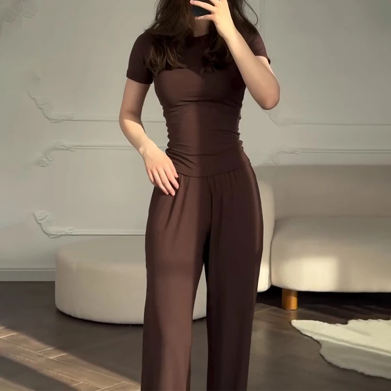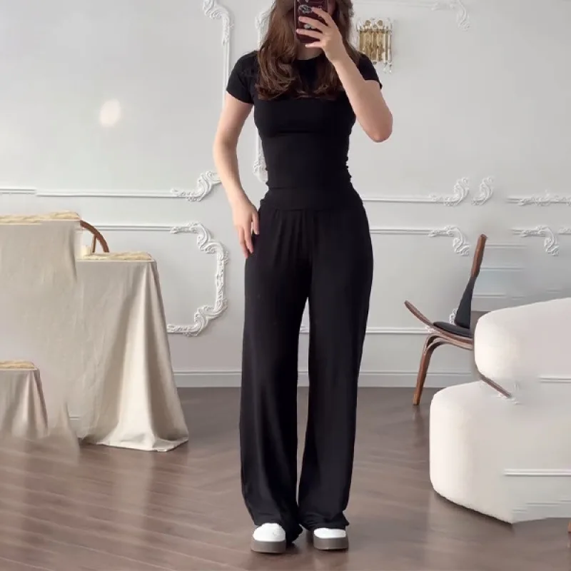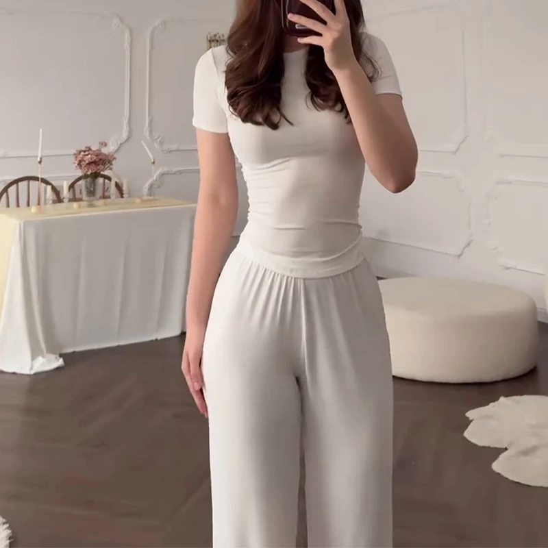 Women’s Casual 2-Piece Set – O-Neck Short Sleeve Top & Elastic Waist Trousers | Spring Summer Loungewear Outfit 2025
