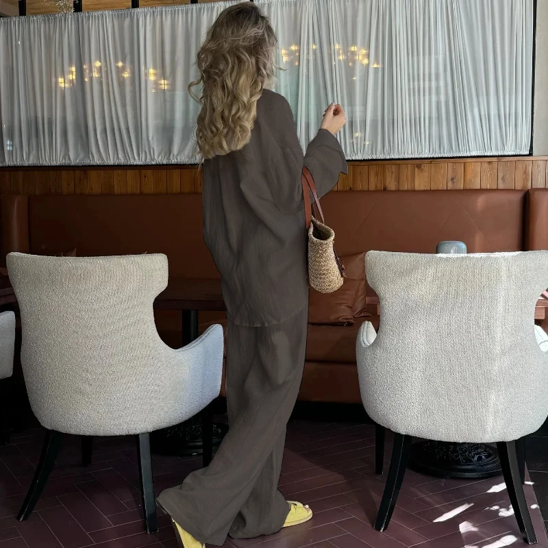 Women’s Casual Cozy Lapel Pink Shirt & Pants Set – Fashion Single-Breasted Blouse with Elastic Waist Trousers | 2025 Spring Loose Outfit
